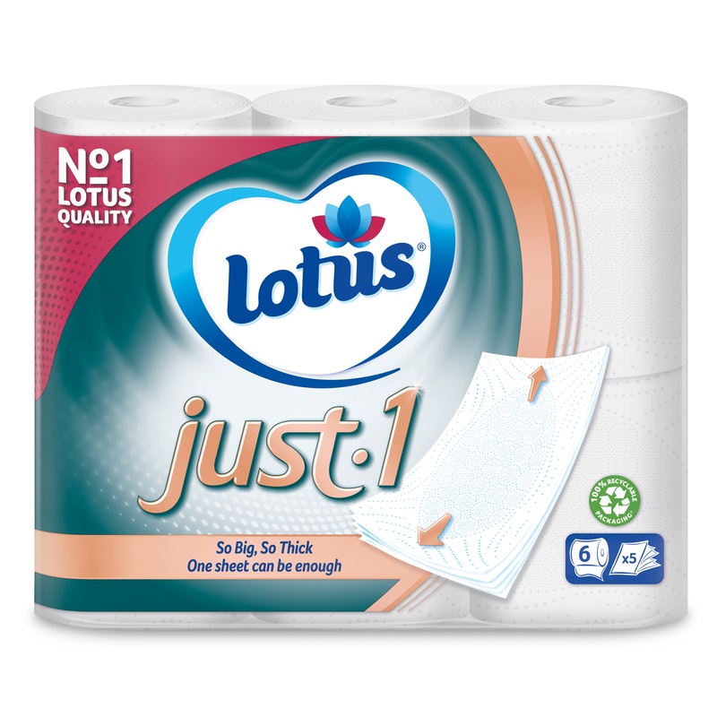 Lotus Just 1 -wc-paperissa on perinteisen kolmen paperikerroksen sijasta peräti viisi kerrosta paperia. Enää wc-paperia ei tarvitse taitella, vaan todellakin yksi tavallista suurempi, pehmeä ja kestävä Lotus Just 1 -arkki voi riittää. Lotus Just 1 -wc-paperirullissa on Flush&Go® -hylsy, jonka voi kierrättää, kompostoida ja huuhtoa alas vessasta. Flush&Go® hajoaa veteen kuten wc-paperi, 100-prosenttisella varmuudella. Kuituraaka-aine selluloosa. Kierrätettävä pakkaus.