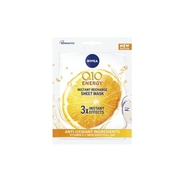NIVEA Q10plusC Anti-Wrinkle + Energy Sheet Mask -kasvonaamio sisältää Q10:tä ja C-vitamiini-seerumia. Vähentää pinnallisia ryppyjä ja antaa iholle uutta energiaa.
