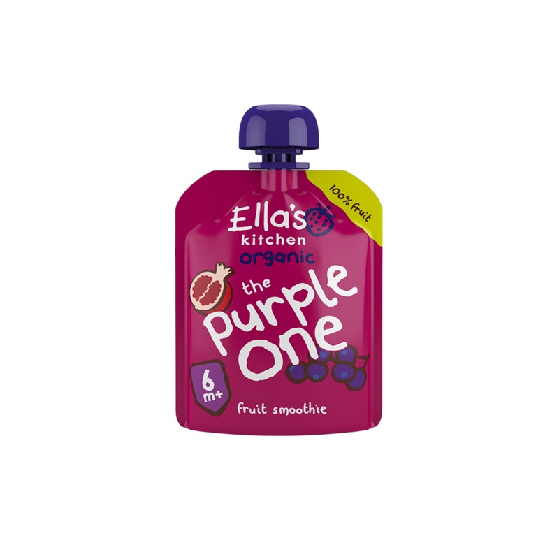 Ella’s Kitchen The Purple One -smoothie on maukas välipala banaaneista, omenoista, mustista viinimarjoista ja granaattiomenan mehusta. 100% luomua tottakai! Sujauta evääksi, nauti piknikillä tai reissussa. Sopii vauvoille 6kk iästä alkaen.