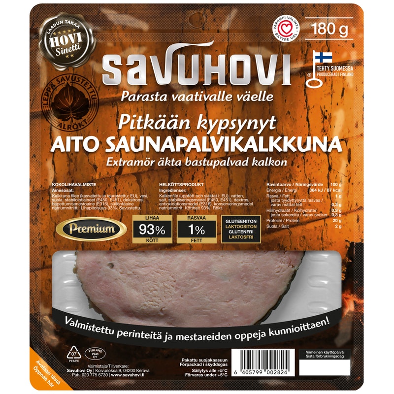 Etusivu » Elintarvikkeet » Liha ja kasviproteiinit » Kinkut ja leikkeleet » Broileri- ja kalkkunaleikkeleet » Savuhovi Aito saunapalvikalkkuna 180g