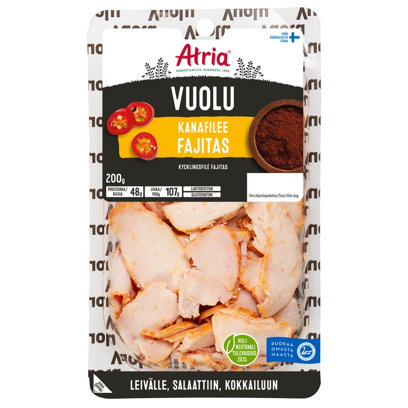 Atria Vuolu Kana Fajitas, nälkään ja naposteluun herkullisia kanafileestä vuoltuja texmex-maustettuja siivuja. Käytä näitä siivuja esimerkiksi täytetteeseen, joihin tulee lisäksi tuoretomaattisalsaa ja lime-chilituorejuustoa sekä tietenkin salaattia. Täyte valmistuu käden käänteessä, on helppo ja nopea tarjottava arkiruokana tai vaikka yllätysvieraiden saapuessa. Atrian liha on aina taatusti suomalaista lihaa, suomalaisilta tiloilta.
