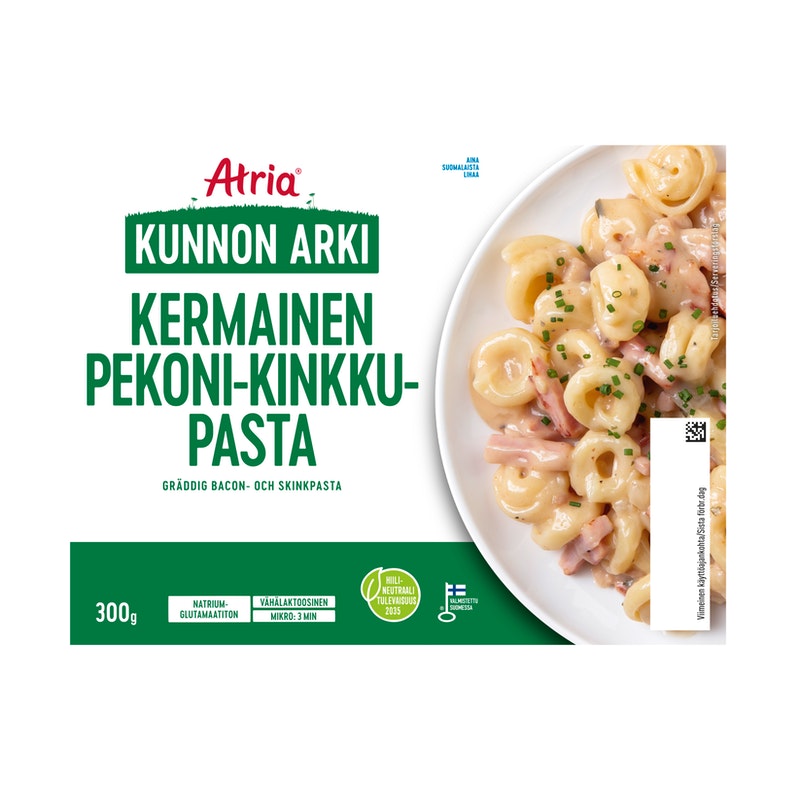 Kermainen pekoni-kinkkupasta on maukas mikroateria koko perheen makuun. Atrian Kunnon Arki Kermaisessa Pekoni-Kinkkupastassa maistuvat pekoni, kinkku, ripaus sipulia ja mausteita, herkullinen pasta ja pehmeän makuinen kerma. Kermaisen pekoni-kinkkupastan lisukkeeksi sopii salaatti tai tomaatin siivut. Valmis mikroateria on helpotus kiireiseen arkeen. Se toimii myös siististi pakattuna lounaana, jonka voi ottaa mukaan esimerkiksi työpaikalle. Lämmitetyn pekoni-kinkkupastan voi halutessaan tuunata tuoreilla yrteillä, esimerkiksi basilikanlehdillä.