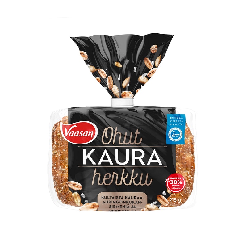 Ihanan ohut leipä, jossa kultaista kauraa, auringonkukansiemeniä ja merisuolaa.
