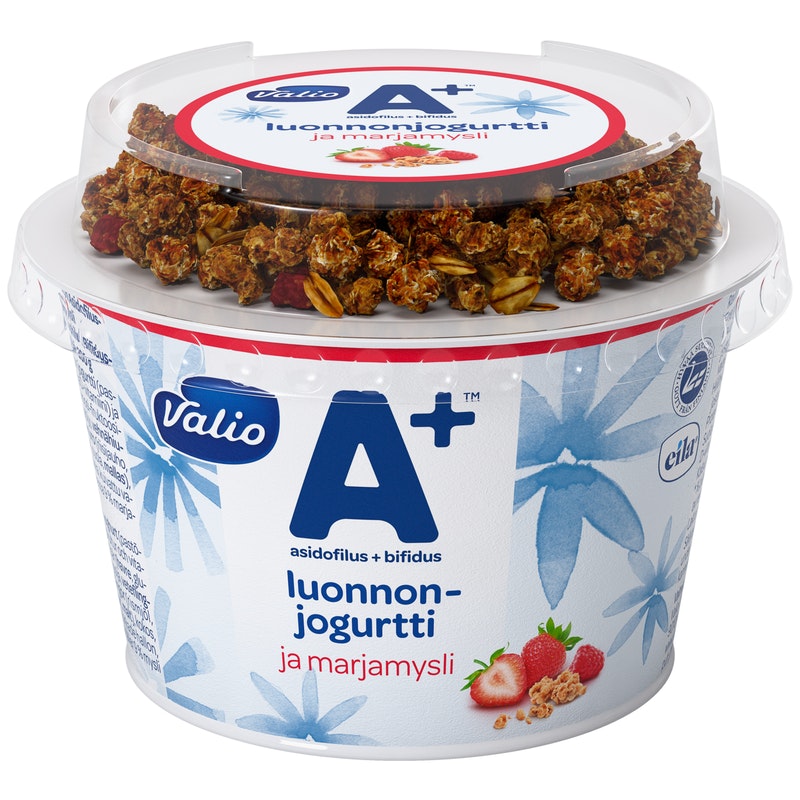 Valio A+™ luonnonjogurtti ja marjamysli on yhdistelmä täyteläistä, maustamatonta ja laktoositonta jogurttia sekä marjaisan rapeaa mysliä. Se sopii erinomaisesti aamu-, ilta- tai välipalaksi. Mukana on myös lusikka. Valio A+™ jogurtit sisältävät asidofilus- ja bifidobakteereja.