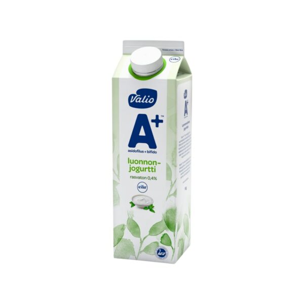 Valio A+™ luonnonjogurtti rasvaton on pehmeää ja keveydestään huolimatta ihanan täyteläistä jogurttia. Nauti sellaisenaan tai esimerkiksi marjojen ja myslin kera. Valio A+™ luonnonjogurtti on laktoositon tuote ja sisältää asidofilus- ja bifidobakteereja.