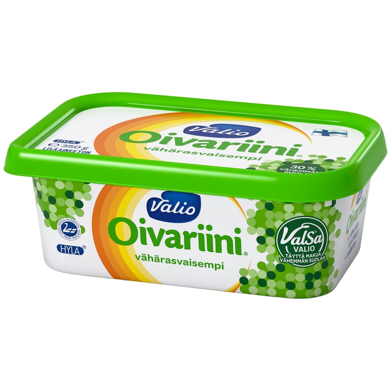 Kevyempi valinta on helppo tehdä, kun mausta ei tarvitse tinkiä. Valio Oivariini® vähärasvaisempi sisältää vähemmän rasvaa ja suolaa mutta on silti täynnä tuttua herkullista makua. Pienempi suolapitoisuus onnistuu, kun osa tavallisesta suolasta korvataan Valio ValSa® maitosuolalla eli maidon luontaisilla mineraaleilla. Sipaise leivälle, käytä ruuanlaitossa tai leivonnassa – ja nauti. Kaikki Valio Oivariini® tuotteet valmistetaan aina tuoreesta suomalaisesta voista ja pehmeästä rypsiöljystä ilman lisäaineita ja säilöntäaineita. Ne ovat luonnollinen valinta koko perheelle.