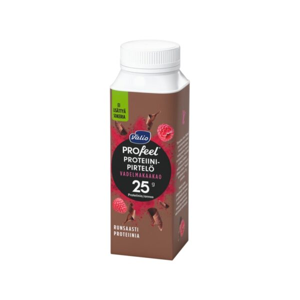 Ruoki tavoitteitasi herkullisesti! Valio PROfeel® proteiinipirtelö vadelmakaakao on ihanasti vadelmasuklaalta maistuva välipalajuoma ilman lisättyä sokeria. Nauti ennen tai jälkeen urheilun tai silloin, kun haluat nautiskella kevyemmin. Yhdessä pakkauksessa on 25 g laadukasta maitoproteiinia, joka sisältää kaikki elimistön tarvitsemat yhdeksän välttämätöntä aminohappoa samassa paketissa. Kokeile myös maukkaita Valio PROfeel® proteiinijuomia!