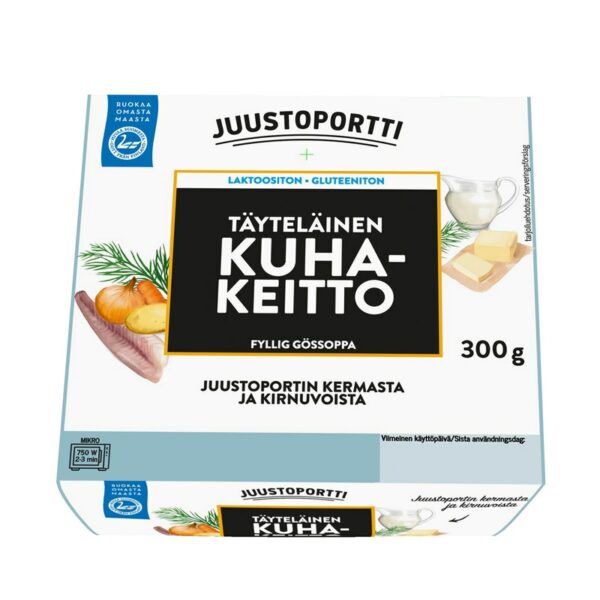 Suomalaista kuhakeittoa lounaaksi? Tämä maistuva keitto valmistetaan suomalaisesta järvikuhasta, mukaan lorautetaan Juustoportin kermaa ja nokare kirnuvoita, kyllä kelpaa herkutella! Uskomme, että parhaista raaka-aineista syntyy myös parasta keittoa. Juustoportin keitot on helppo ottaa mukaan evääksi ja viettää hieman herkullisempia ruokahetkiä. Keitot ovat laktoosittomia ja gluteenittomia, niissä on myös Hyvää Suomesta-merkki. Ne valmistetaan ammattitaidolla ja intohimolla Juustoportin omassa ruokatehtaassa, Kasvisgalleriassa Kuopiossa. Maista ja ihastu! Juustoportti on perheyritys, joka on tunnettu laadukkaista ja innovatiivisista tuotteistaan. Lisäksi yritys on saanut tunnustusta hyvänä työnantajana ja perinteisen toimialan rajojen rikkojana, saaden mm. Euroopan ensimmäisenä eläinten hyvinvointia mittaavan Welfare Quality® -sertifikaatin. Juustoportti on jo yli 30 vuoden ajan luonut joka kuukausi yhden uuden, pysyvän työpaikan.