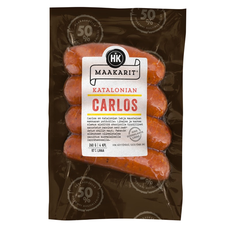 HK Maakarit® Katalonian Carloksen maku pohjautuu espanjalaiseen makumaailmaan. Karkearakenteisen ja lihaisan grillimakkaran maku syntyy paahdetusta chilistä, savustetusta paprikasta, valkosipulista ja mustapippurista. Jalapeno antaa ripauksen tulisuutta. HK Maakarit® -artesaanimakkarat valmistetaan Vantaan Pakkalassa perinteisiin kädentaitoihin luottaen, aina suomalaisesta lihasta. Lajittele pakkaus käytön jälkeen muovina.