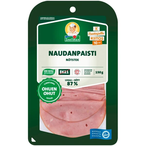 Aikanaan Suomen ensimmäinen ohuen ohut naudanpaisti. Naudan sisä-, ulko- ja kulmapaistista tehtävä leikkele on ehdoton valinta lämminsavustetusta naudanlihasta pitävälle.