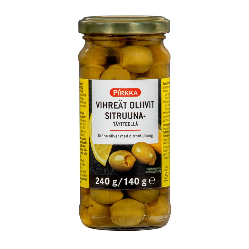 Pirkka vihreät oliivit sitruunatäytteellä 240g/140g