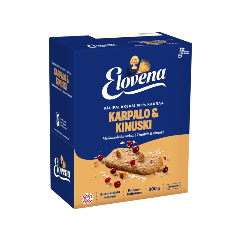 Herkullisessa Elovena Karpalo-Kinuski Välipalakeksissä maistuvat kirpeät karpalot ja makea kinuski. Täysjyväkeksin vilja on 100% kauraa ja se on leivottu rypsiöljyllä. Runsaskuituiselle keksille on myönnetty Suomen Sydänliiton Sydänmerkki. Kätevä, yksittäispakattu keksi on helppo ottaa mukaan ja nauttia aina kun tarvitsee energiaa maistuvassa muodossa. Tuote on valmistettu Suomessa suomalaisesta kaurasta.