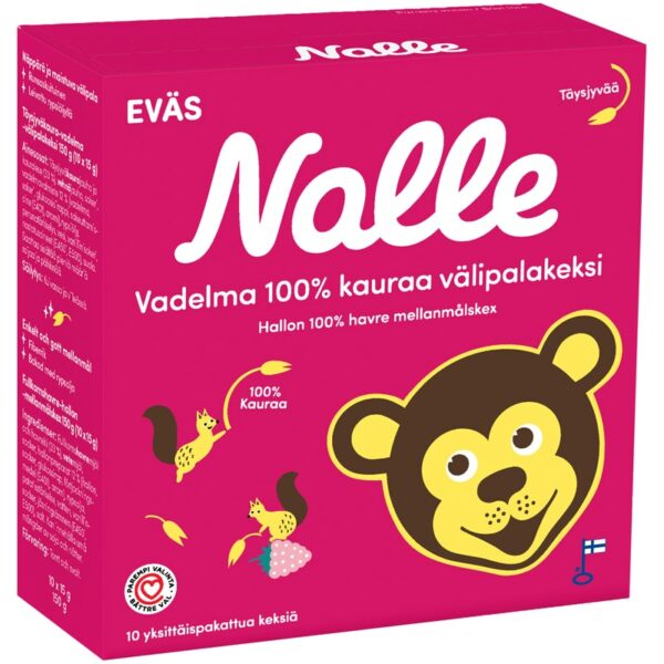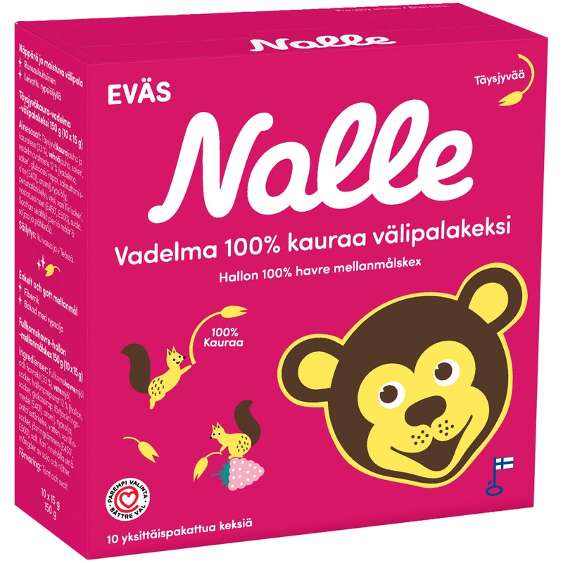 Nalle Välipalakeksit ovat lapsille suunniteltuja välipaloja. Välipalakekseissä yhdistyvät vadelman maku, terveellinen täysjyväkaura ja kuitu. Pieni keksi sopii pieneen käteen.
