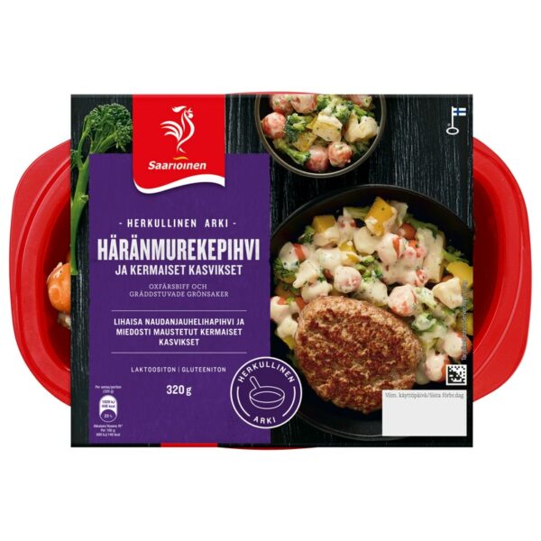 Lihaisa naudanjauhelihapihvi ja miedosti maustetut kermaiset värikkäät kasvikset. Mehevän jauhelihapihvin raaka-aineena suomalainen naudanliha.