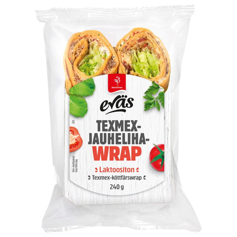 Täyteläinen Eväs-wrap sopii hetisyötäväksi välipalaksi ja kevyeksi lounaaksi. Pehmeä tomaattitortilla on maustettu mausteisella Tex Mex -levitteellä. Maukkaan levitteen päällä on naudan jauhelihaa, cheddar-juustoa, rapeaa salaattia sekä taco-lastumurua. Herkullinen kokonaisuus on kääräisty sinulle heti nautittavaksi.