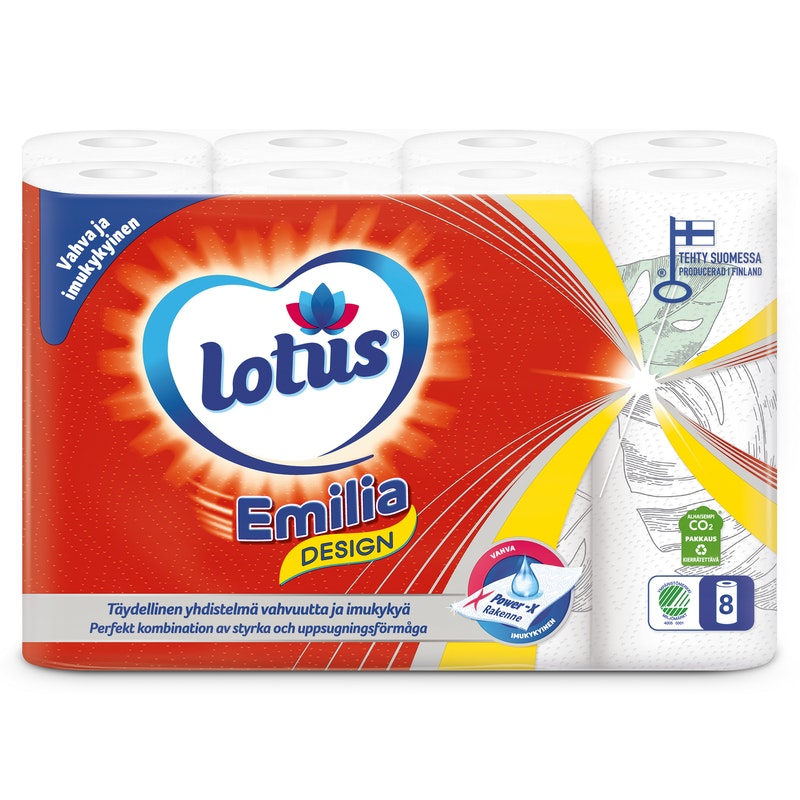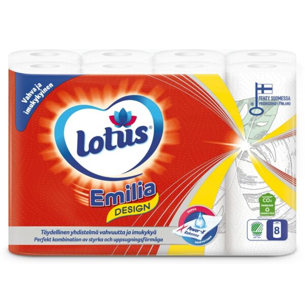 Lotus Emilia Design talouspaperi on vahvaa kosteana ja niin imukykyistä, että yksikin arkki voi riittää. Käytännöllisyyden lisäksi se tuo arkeen myös iloa pirteällä ja värikkäällä painatuskuviolla. Lotus Emilia Design talouspaperit on valmistettu Suomessa Nokian paperitehtaalla. Lotus Emilia Design talouspaperilla on Joutsenmerkki ja se on valmistettu FSC-sertifioidusta kuidusta (kuituraaka-aineet: selluloosa, kierrätyskuitu) ja sen pakkaus 100% kierrätettävä.