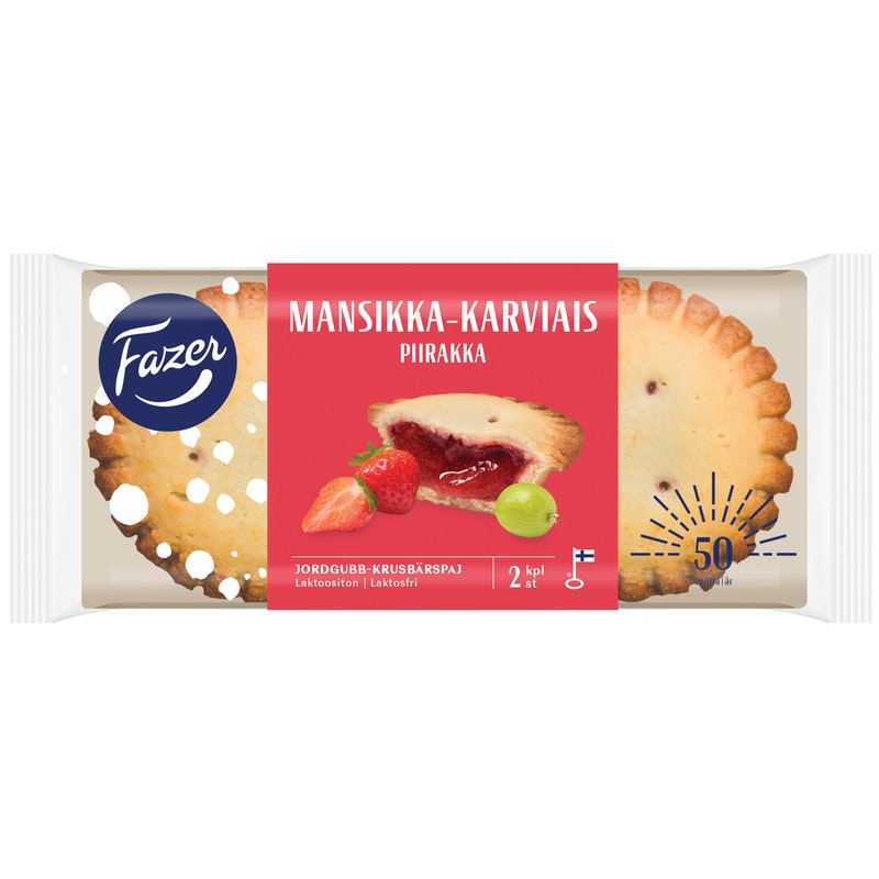 Fazer Marjapiirakat ovat klassikoita, joita on leivottu Fazerin Vantaan leipomossa jo vuodesta 1971. Niissä täyteläinen murotaikina sulkee sisäänsä runsaasti aidon luonnollista täytettä. Mansikka-karviaispiirakka vie muistot mummolan kesäisiin maisemiin makean raikkaalla maullaan.
