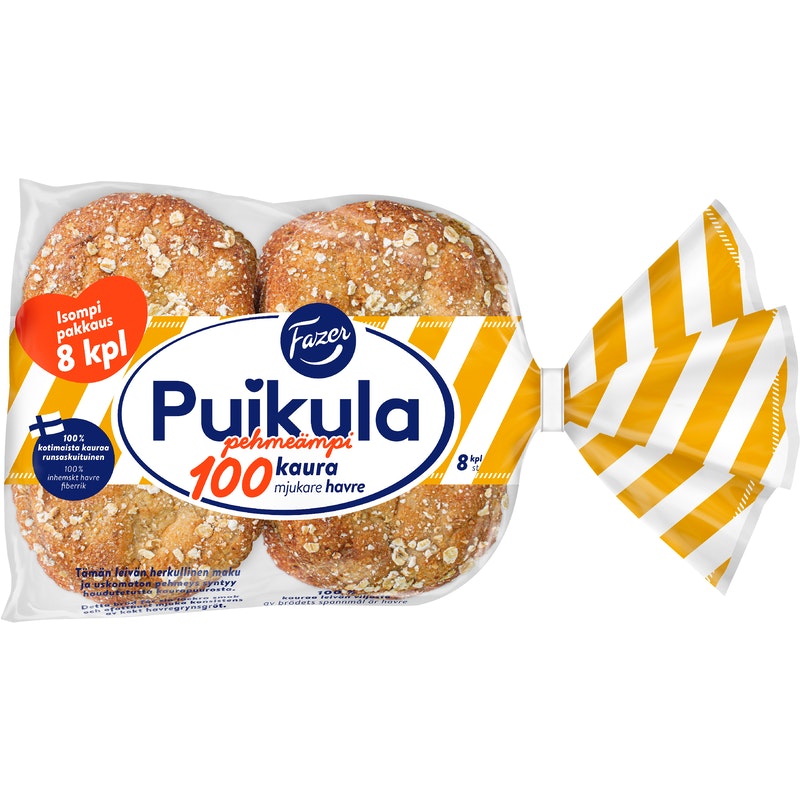 Fazer Puikula Pehmeämpi 100Kaura on uskomattoman pehmeä ja herkullinen kauraleipä. Sen maun ja pehmeyden salaisuus on haudutetussa kaurapuurossa, jonka ansiosta leipä tuntuu pehmeältä ja tuoreelta monta päivää. Leipä leivotaan Suomessa.