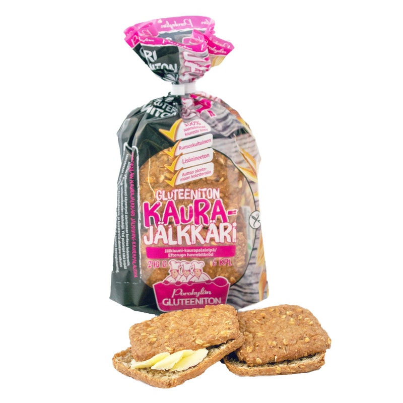 Kaurajälkkäri on gluteeniton jälkiuunipalaleipä, jonka viljaraaka-aineista 100% on suomalaista gluteeniton kauraa. Lisäaineeton ja runsaskuituinen herkkuleipä. Leivottu aitoon taikinajuureen. Pussissa 6 palaleipää. Maidoton, laktoositon, runsaskuituinen. Auttaa alentamaan kolesterolia.