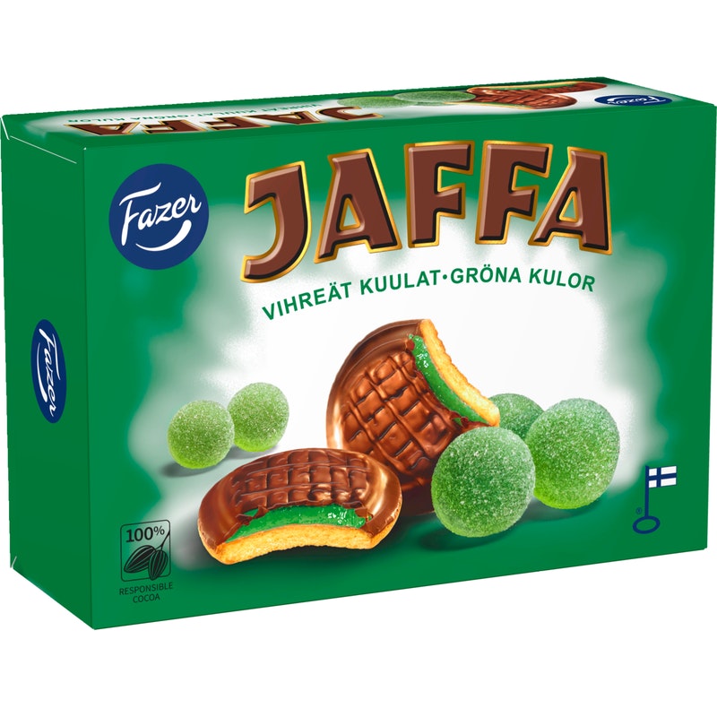 Jaffa keksi on leivoskeksien klassikko, jossa on kuohkean pehmeän leivospohjan päällä marmeladia ja täyteläistä tummaa suklaata. Jaffa Vihreät kuulat -keksissä kohtaa kaksi klassikkoa, Vihreiden kuulien makuinen marmeladitäyte ja maistuva Jaffa-keksi. Hitti jo syntyessään! Mikä parasta, keksit leivotaan ilman palmuöljyä ja niihin on käytetty 100 % vastuullisesti tuotettua kaakaota. Koko perheen suosikkikeksit maistuvat kemuissa tai kahvipöydässä.