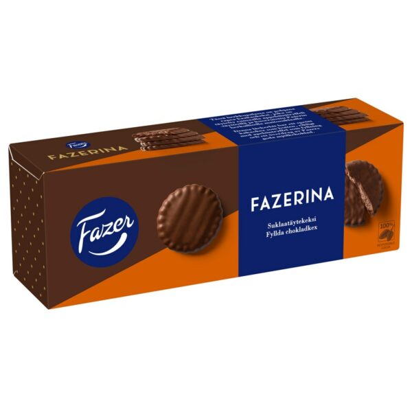 Fazerina-suklaakeksi kutsuu todelliseen herkutteluun. Fazer maitosuklaalla kuorrutetussa keksissä on viehkeä Fazerinan makuinen täyte. Keksiin käytetty suklaa on valmistettu 100 % vastuullisesti tuotetusta kaakaosta. Istahda nautiskelemaan suklaakeksi tai pari yksin tai ystävän kanssa.