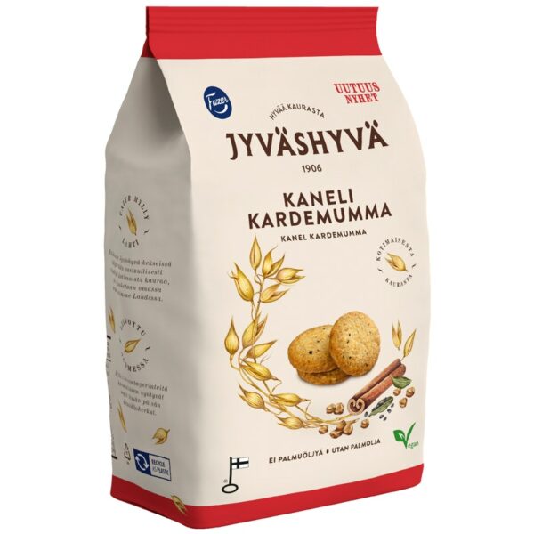 Herkullisen rapeat Jyväshyvän kanelin ja kardemumman makuiset kaurakeksit leivotaan kotimaisesta kaurasta Suomessa. Isosta pussillisesta keksejä riittää herkuteltavaa isoille ja pienille.
