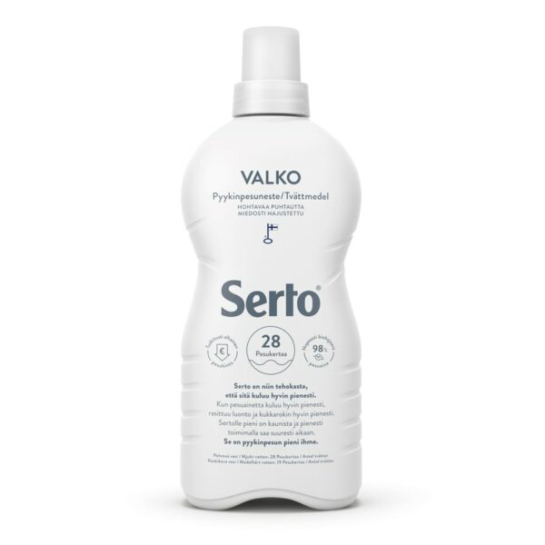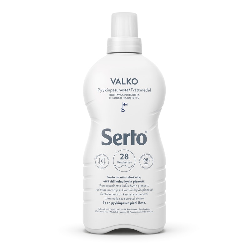 Estää harmaantumista ja säilyttää vaaleat värit hohtavan puhtaina. Serto Valko Pyykinpesuneste on suunniteltu puhdistamaan vaaleat tekstiilit tehokkaasti jo matalissa lämpötiloissa. Pyykinpesunesteen optiset kirkasteet säilyttävät vaaleat tekstiilit hohtavan puhtaina myös usein toistuvassa pesussa. Miedosti hajustettu. Ei sovellu villalle ja silkille.