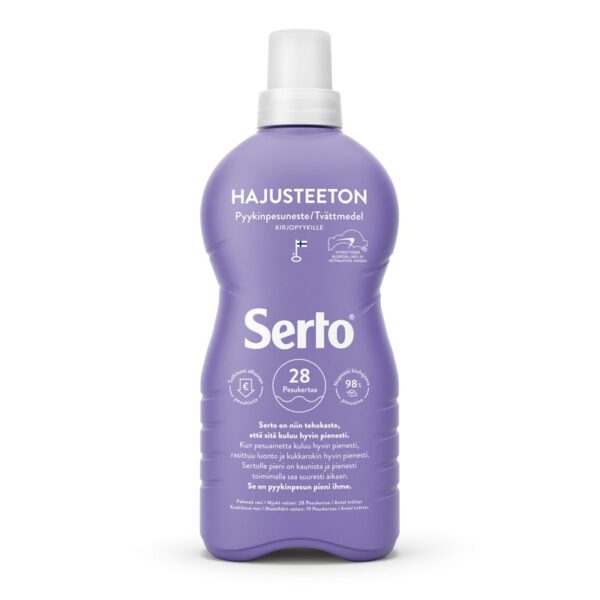 Puhdistaa tehokkaasti ja pitää värit kirkkaina. Serto Hajusteeton Pyykinpesuneste on suunniteltu erityisesti värillisen pyykin pesuun ja saavuttaa ihanteellisen pesutuloksen jo alhaisissa pesulämpötiloissa. Pyykinpesunesteen värisuoja suojaa tekstiilien värejä pesussa ja pitää ne kirkkaina. Hajusteeton. Ei sovellu villalle ja silkille.