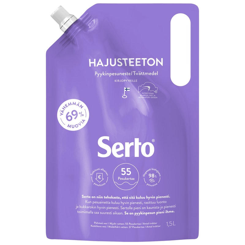 Puhdistaa tehokkaasti ja pitää värit kirkkaina. Serto Herkkä Pyykinpesuneste on suunniteltu erityisesti värillisen pyykin pesuun ja saavuttaa ihanteellisen pesutuloksen jo alhaisissa pesulämpötiloissa. Pyykinpesunesteen värisuoja suojaa tekstiilien värejä pesussa ja pitää ne kirkkaina. Hajusteeton. Ei sovellu villalle ja silkille.