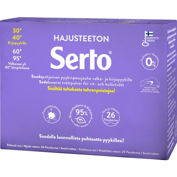 Hajusteeton ja riittoisa soodapohjainen pyykinpesujauhe, joka puhdistaa pyykkisi tehokkaasti jo alhaisissakin lämpötiloissa. Serto Hajusteeton Pyykinpesujauhe sopii sekä kirjo-, että valkopyykille. Kirjopyykin voit pestä matalammissa 30-40 asteen ohjelmissa, kun taas valkopyykille suosittelemme 60-95 asteen pesuohjelmia, sillä Serto Hajusteettoman valkaisuaine aktivoituu 60 asteessa. Sen entsyymikoostumus ehkäisee nukkaantumista ja pitää pyykin miellyttävän pehmeänä. Hajusteettoman erityinen tahranpoisto-ominaisuus puhdistaa tehokkaasti sitkeätkin tahrat – et tarvitse erillistä tahranpoistoainetta. Pesujauheen sisältämä sooda parantaa pesutehoa, neutraloi hajuja, ja auttaa pitämään värit kirkkaina perusta toiseen. Tuote ei sisällä zeoliittia eikä fosfaattia. Ei sovellu villalle ja silkille.