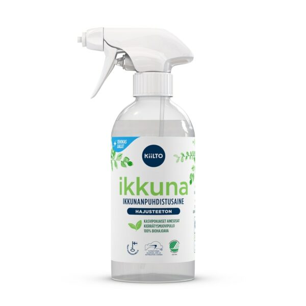 Kiilto Hajusteeton Ikkunanpuhdistaja puhdistaa erilaiset lasi-ja peilipinnat helposti, tehokkaasti sekä ympäristön huomioiden. Tuotteelle on myönnetty Joutsenmerkki ja Allergiatunnus.