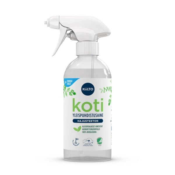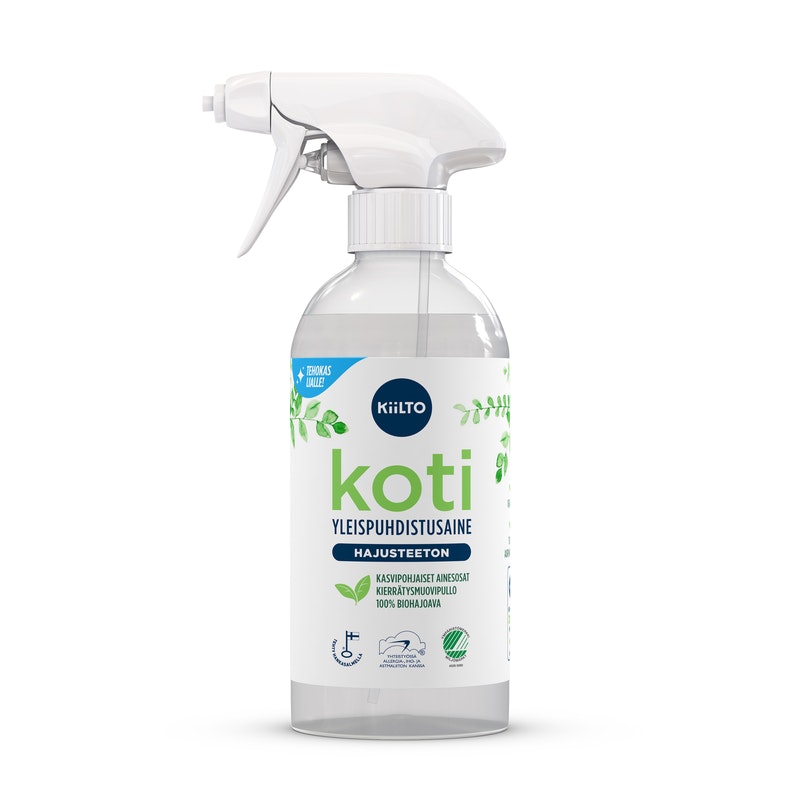 Kiilto Hajusteeton Yleispuhdistusaine puhdistaa kaikki kodin pesunkestävät pinnat tehokkaasti sekä ympäristön huomioiden. Tuotteella on Joutsenmerkki ja Allergiatunnus.