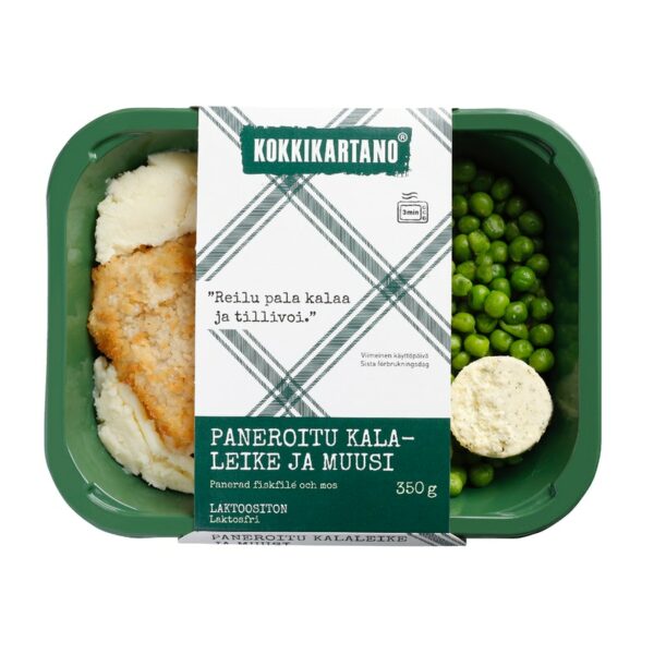 Tähän annosateriaan Kokkikartanolla laitettiin leivitettyä alaskanseitifilettä ja sen kaveriksi suomalaisista perunoista ja Valio® kermasta tehtyä kunnon perunamuusia. Kalaleike sai lisukkeeksi myös herneitä ja vielä tillivoinappi makua tuomaan. Kelpaa herkutella.