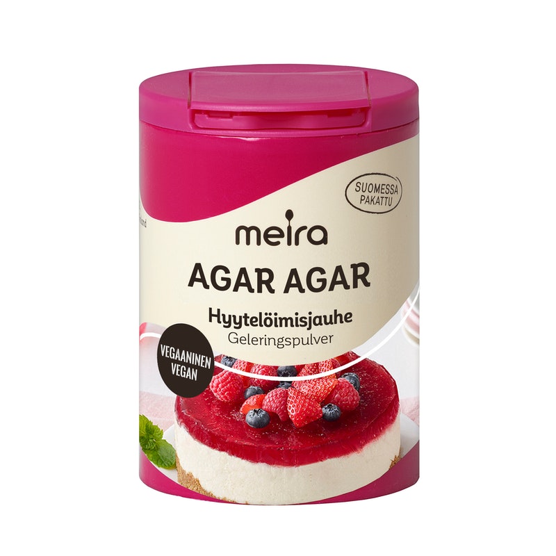 Meira Agar agar -hyytelöimisjauhe on vegaaninen vaihtoehto ruuanlaittoon ja leivontaan. Tuote soveltuu hyydykkeiden, hyytelöiden ja marmeladien valmistukseen ilman liivatetta. Tuotetta on helppo käyttää, sillä se ei jähmety liian nopeasti. Agar agar -hyytelöimisjauhe on valmistettu merilevästä, eikä se sisällä eläinperäisiä ainesosia.