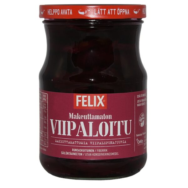 Felix® Makeuttamaton viipalepunajuuri on mainio tuote niille, jotka haluavat välttää sokerin käyttöä, sillä näihin punajuuriin ei ole lisätty lainkaan sokeria. Kokeile esimerkiksi omatekoisen juuresmuusin raaka-aineena, makeuttamaton punajuuri antaa musille sekä makua että näköä. Felix punajuuret ovat myös terveellinen vaihtoehto, sillä ne ovat runsaskuituisia. Tuote on säilöntäaineeton ja sopii vegaanista ruokavaliota noudattavalle. Lisäksi purkissa on helppo avata -kansi, joka lisää käyttömukavuutta. Felix – herkkuja ruokapöytäään®.