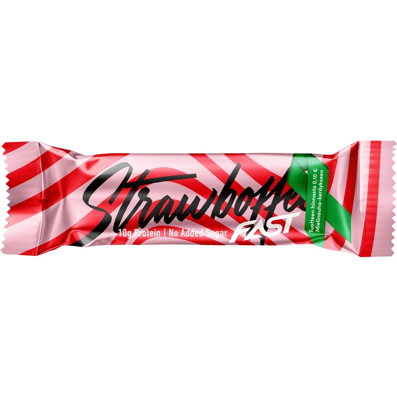 FAST Strawboffeessa yhdistyvät suussa sulava mansikan- ja toffeenmakuinen täyte, sekä herkullinen maitosuklaakuorrute. Se on karkkimaisin proteiinipatukka pehmeällä suutuntumalla ilman grammaakaan lisättyä sokeria tai palmuöljyä. FAST Strawboffee on piristävän erilainen proteiinipatukkaelämys niin arkeen kuin karkkipäivään. Sen sisältämät proteiinit edistävät lihasmassan kasvua ja ylläpitämistä