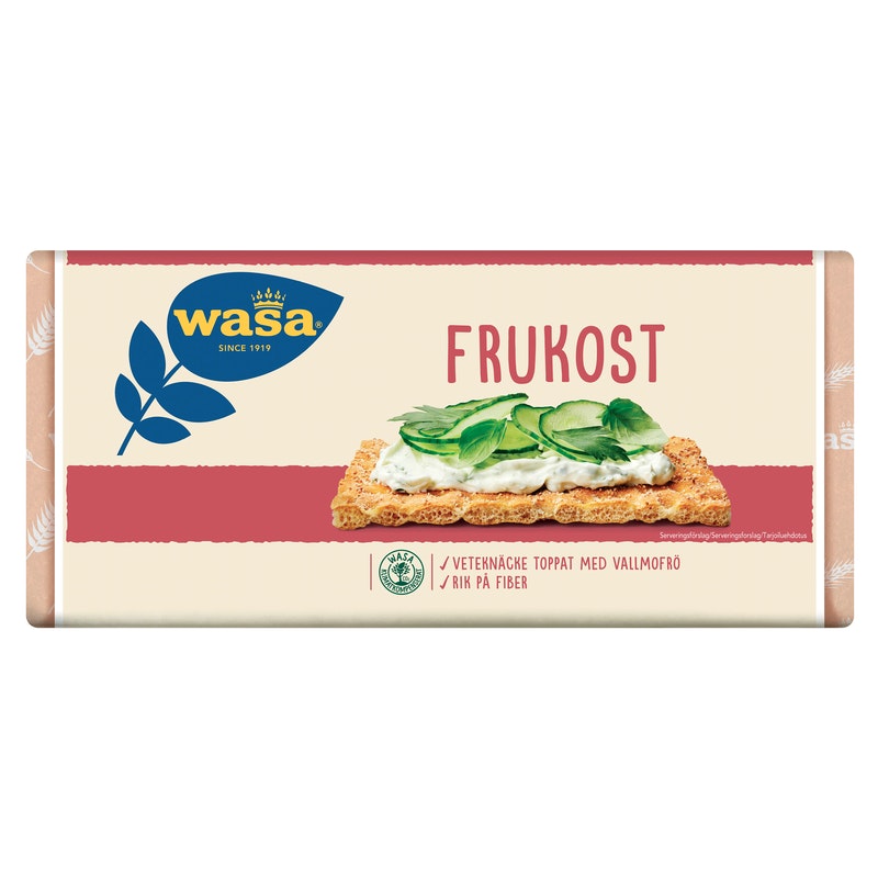Wasa Frukost on miedon makuinen ja murea näkkileipä, joka on leivottu vehnäjauhoista. Sen pinnalla on herkullisen kullankeltaisiksi paahdettuja unikonsiemeniä. Nimensä mukaisesti se sopii täydellisesti koko perheen rapeaksi ja maukkaaksi päivän aloitukseksi.