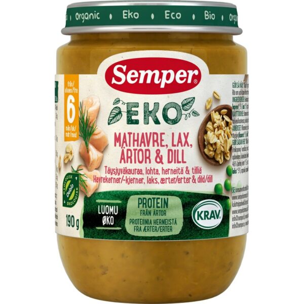 Semper Luomu Täysjyväkauraa, lohta ja herneitä on terveellinen ja herkullinen ruoka pienille lapsille. Hyvä aloitusateria, mieto maku, sileä rakenne. Maidoton ateria sopii lapsille noin 6 kuukauden iästä alkaen. Kaikki Semper lastenruoka on valmistettu ilman lisättyä suolaa, sokeria tai säilöntäaineita.