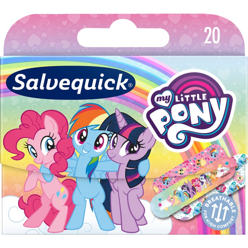 Salvequick My Little Pony on uusi vettä ja likaa hylkivä lastenlaastari, joka lohduttaa ja auttaa haavan hoidossa. Joustava ja hengittävä. Kiinnittyy hellävaraisesti. CE-merkitty lääkinnällinen laite. Valmistaja: Orkla Care AB.