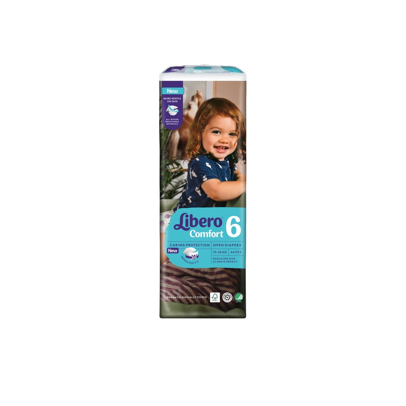 Libero Comfort koko 6 on vaippa, jolla on mukava ja luotettava istuvuus ja sopii parhaiten silloin, kun pienokaisesi painaa 13-20 kg. Osana Liberon tavoitetta vähentää ilmastovaikutuksia, yli 50 % pakkauksesta on valmistettu uusiutuvista materiaaleista ja Liberon vaippatehtaissa käytetään vain uusiutuvaa sähköä. Libero Comfort -vaipassa on kaksinkertaiset vuotosuojat ja se istuu pehmeästi ja mukavasti reisien ympärillä. Tämä yhdessä sekä ohuen että huippuimukykyisen ytimen kanssa takaa, että Libero Comfort antaa lapsellesi vuotosuojaa kaikissa tilanteissa. Vaippojen pehmeyden ja joustavuuden ansiosta ne tuntuvat aina yhtä mukavilta päällä. Vaipat ovat dermatologisesti testattuja, Joutsenmerkittyjä, Asthma Allergy Nordicin suosittelemia ja FSC-sertifioituja.