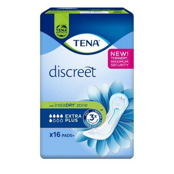 TENA Discreet Extra Plus ainutlaatuisella InstaDRY™-ominaisuudella antaa kolmitehoisen suojan ohivuotoja, hajua ja kosteaa tunnetta vastaan. TENA Discreet Extra Plus on erittäin varma ja paljon imukykyisempi kuin kuukautissuoja. Suunniteltu antamaan erittäin tehokkaan vuotosuojan, minkä ansiosta käyttäjä tuntee olonsa välittömästi kuivaksi ja varmaksi kaikissa tilanteissa. InstaDRY™-teknologia mahdollistaa moninkertaisen imunopeuden ja kuivuuden. Fresh Odour Control -ominaisuus takaa itsevarman olon. Kolmitehoinen suoja – kuiva tunne, varma olo ja Odour Control -ominaisuus hajuja vastaan.