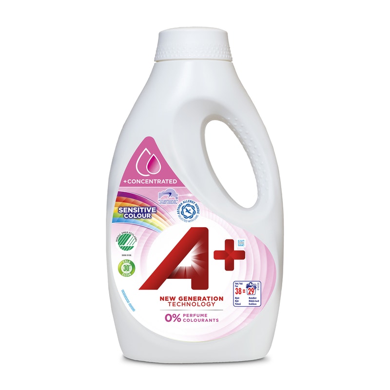A+ Sensitive Color pyykinpesuneste on kirjopyykille suunnattu ja tehokas matalissakin lämpötiloissa. Hajusteeton. Tuote on Joutsenmerkitty ja sillä on Allergia- ja Astmaliiton tunnus. Pakkaus on tehty 99% kierrätysmuovista, ja sen voi käytön jälkeen kierrättää.