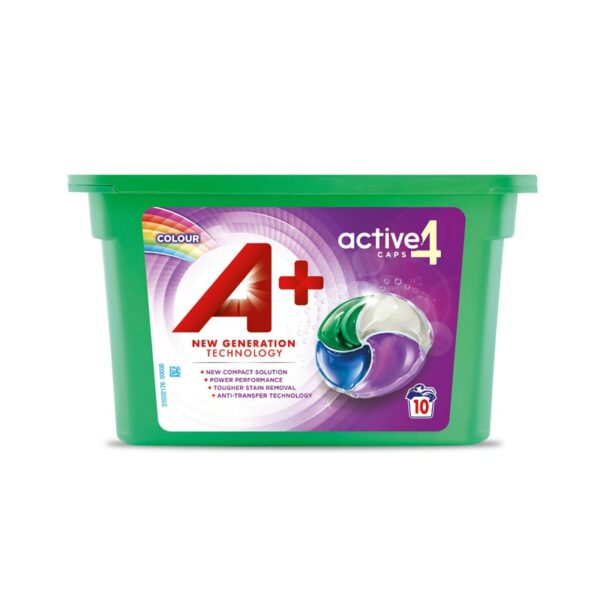 Väripyykille tarkoitettu A+ Active4 Caps pyykinpesukapseleissa on parannettu, tehokkaampi koostumus: Tehoentsyymejä sisältävä pesuaine auttaa pitämään tekstiilien värit kirkkaina. Pyykinpesukapseli on kätevä tapa annostella pyykinpesuaine oikein.
